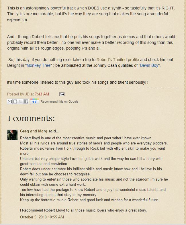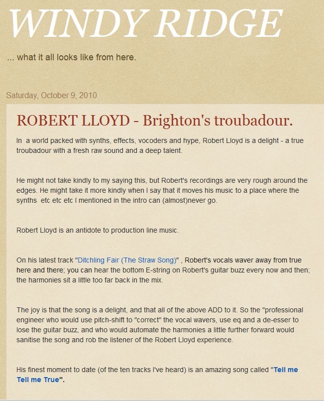 This critical review of Robert Lloyd songs was posted by John D Wilson in October 2010 (on the blog website Windy Ridge -what it looks like from here)